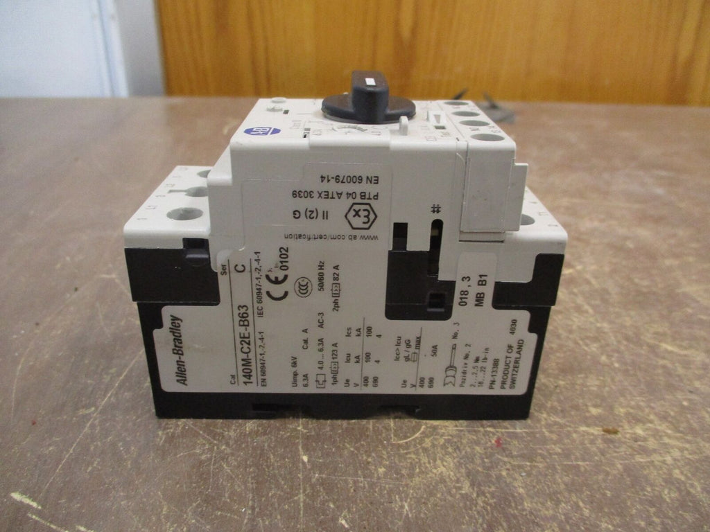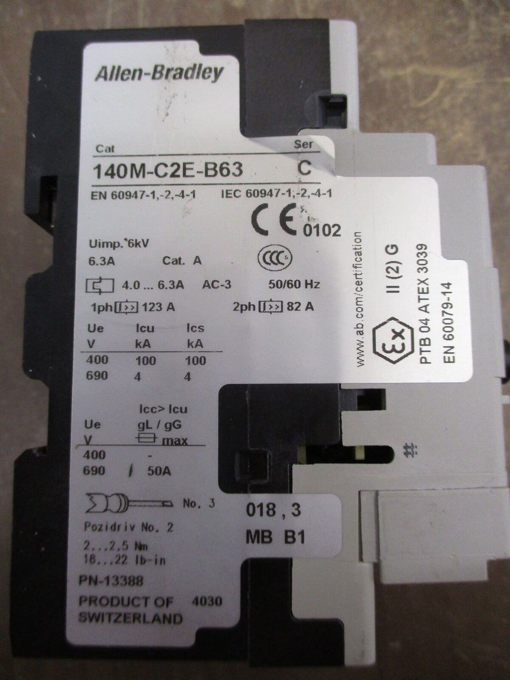 Allen-Bradley Manual Motor Protector 140M-C2E-B63 Ser. C Trip: 4.0-6.3A_x000D_ Allen-Bradley Manual Motor Protector Part #: 140M-C2E-B63 Ser. C Trip: 4.0-6.3 A *Broken Plate* Used Loc: 27C4-30