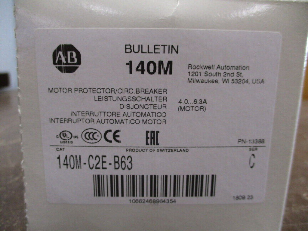 Allen-Bradley Manual Motor Protector 140M-C2E-B63 Ser. C Trip: 4.0-6.3A_x000D_ Condition: New – Open boxAmperage: 4 to 6.3 ampsBrand: Allen-BradleyMPN: 140M-C2E-B63 Allen-Bradley Manual Motor Protector 140M-C2E-B63 Ser. C Trip: 4.0-6.3A Allen-Bradley Manual Motor Protector Part #: 140M-C2E-B63 Ser. C Trip: 4.0-6.3 A New Surplus Loc: 28A2-20 Allen-Bradley Manual Motor Protector Part #: 140M-C2E-B63 Ser. C Trip: 4.0-6.3 A New Surplus Loc: 28A2-20