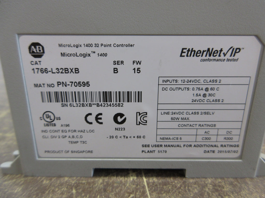 Allen-Bradley MicroLogix 1400 Controller Part #: 1766-L32BXB Ser. B FRN. 15 Used Loc: 57B5-8