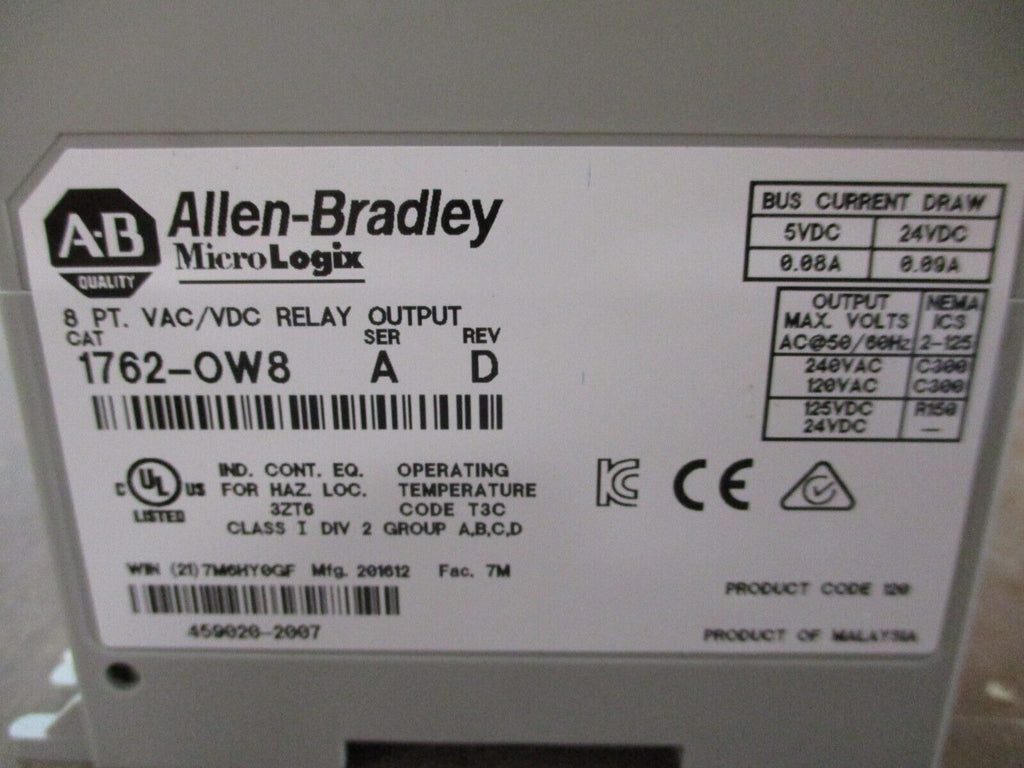Allen-Bradley MicroLogix VAC/VDC Relay Output Module 1762-OW8 Ser. A Rev. D 8PT_x000D_ Condition: UsedBrand: Allen-BradleyMPN: 1762-OW8Type: PLC Output Module Allen-Bradley MicroLogix VAC/VDC Relay Output Module 1762-OW8 Ser. A Rev. D 8PT Allen-Bradley MicroLogix VAC/VDC Relay Output Module Part #: 1762-OW8 Ser. A Rev. D 8PT Used Loc: 20G2-30 Allen-Bradley MicroLogix VAC/VDC Relay Output Module Part #: 1762-OW8 Ser. A Rev. D 8PT Uséd Loc: 20G2-30