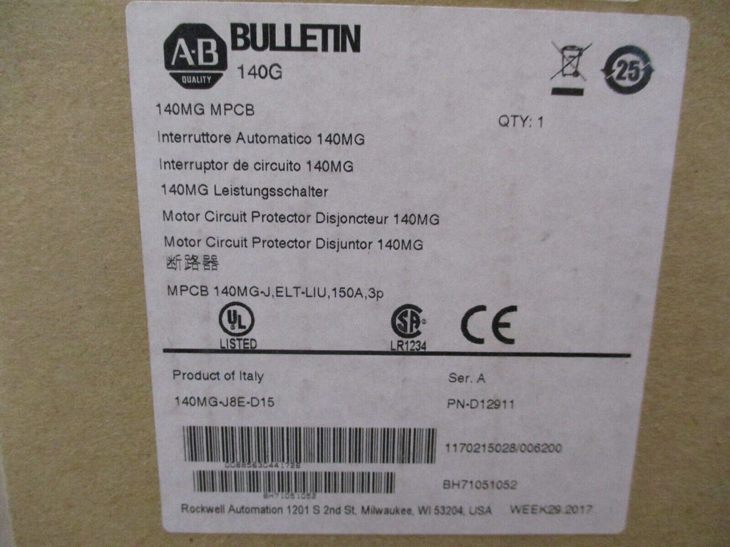 Allen-Bradley Motor Protector Circuit Breaker 140MG-J8E-D15 Ser. A 150A 480V 3P Condition: New – Open boxBrand: Allen-BradleyMaximum Amperage: 150 A Allen-Bradley Motor Protector Circuit Breaker 140MG-J8E-D15 Ser. A 150A 480V 3P Allen-Bradley Motor Protector Circuit Breaker Part #: 140MG-J8E-D15 Ser. A 150 A 480 V 3P New Surplus Loc: 20A1-20 Allen-Bradley Motor Protector Circuit Breaker Part #: 140MG-J8E-D15 Ser. A 150 A 480 V 3P New Surplus Loc: 20A1-20