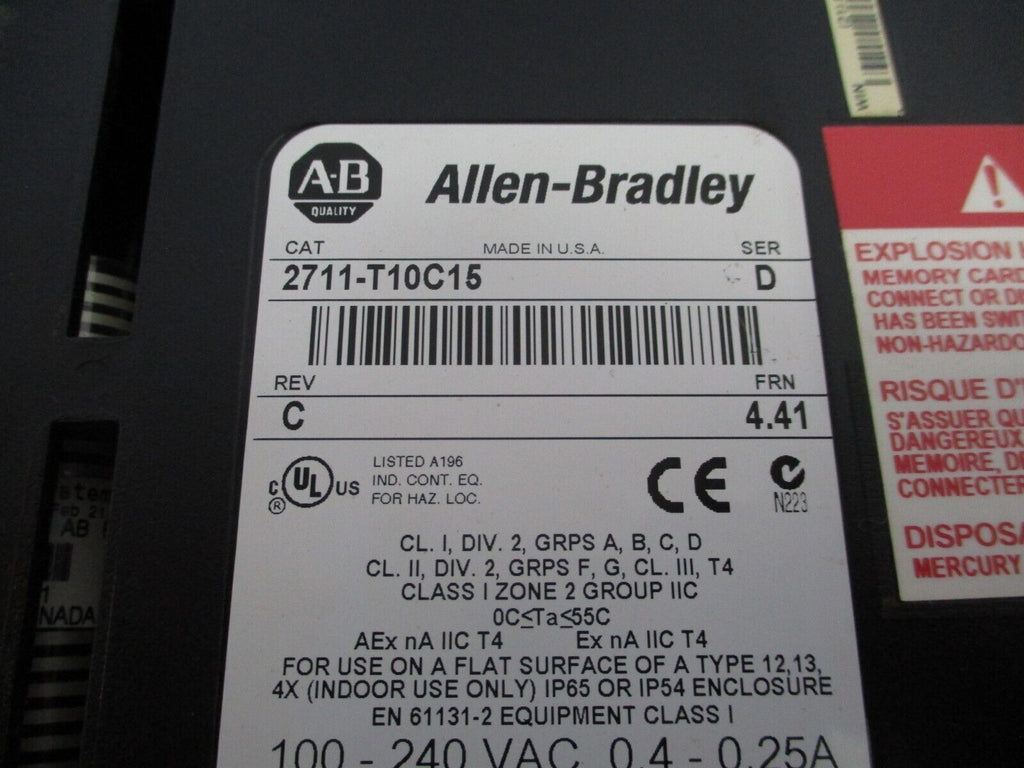 Allen-Bradley PanelView 1000 2711-T10C15 Ser. D Rev. C FRN: 4.41 Used_x000D_ Condition: UsedBrand: Allen-BradleyType: PanelViewMPN: 2711-T10C15 Allen-Bradley PanelView 1000 2711-T10C15 Ser. D Rev. C FRN: 4.41 Used Allen-Bradley PanelView 1000 Part #: 2711-T10C15 Ser. D Rev. C FRN: 4.41 Used Loc: 20A1-15 Allen-Bradley PanelView 1000 Part #: 2711-T10C15 Ser. D Rev. C FRN: 4.41 Uséd Loc: 20A1-15