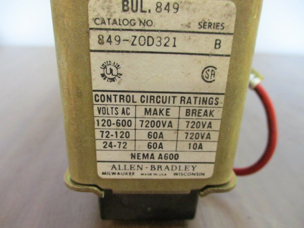 Allen-Bradley, Pneumatic Timing Relay, part #:849-ZOD321, Ser.B, 120V coil, used Condition: UsedMPN: 849-ZOD321Brand: Allen-Bradley Allen-Bradley, Pneumatic Timing Relay, part #:849-ZOD321, Ser.B, 120V coil, used Allen-BradleyPneumatic Timing RelayPart #:849-ZOD321Ser. B120V coilUsedLoc 15A2-7 Allen-BradleyPneumatic Timing Relay Part #:849-ZOD321 Ser. B 120V coil Uséd Loc 15A2-7