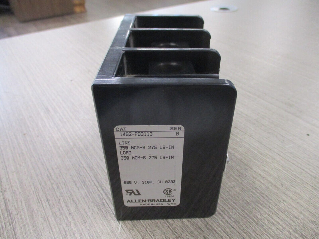 Allen-Bradley Power Distribution Block 1492-PD3113 Ser. B 310A 600V 39 Used Allen-Bradley Power Distribution Block Part #: 1492-PD3113 Ser. B 310A 600V 3P Line : 350MCM-6Load : 350MCM-6UsedLOC: 28A1-3 Allen-Bradley Power Distribution Block Part #: 1492-PD3113 Ser. B 310A 600V 3P Line : 350MCM-6Load : 350MCM-6UsédLOC: 28A1-3