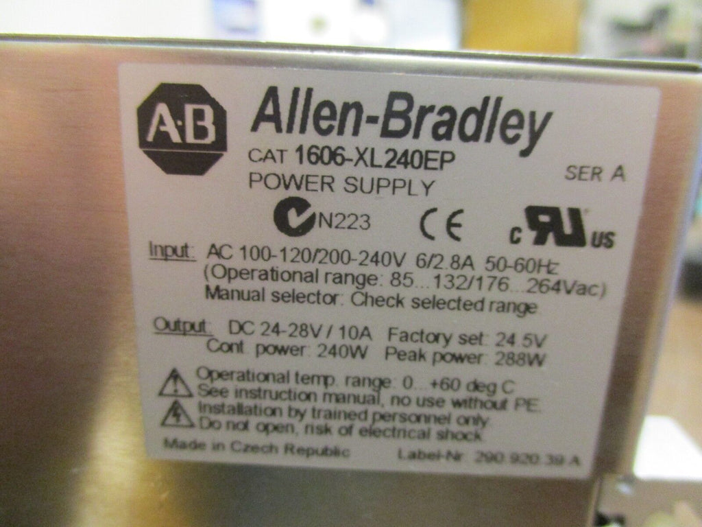 Allen-Bradley Power Supply 1606-XL240EP Used Condition: UsedBrand: Allen-BradleyMPN: 1606-XL240EP Allen-Bradley Power Supply 1606-XL240EP Used Allen-Bradley Power SupplyPart #: 1606-XL240EP AC Input:100-120/200-240V6/2.8A50-60HzDC Output:24-48/10A24.5VUsedLOC 14H5-41 Allen-Bradley Power Supply Part #: 1606-XL240EP AC Input: 100-120/200-240V 6/2.8A 50-60Hz DC Output: 24-48/10A 24.5V Uséd LOC 14H5-41
