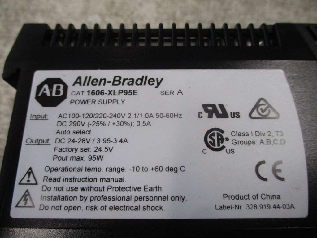 Allen-Bradley Power Supply Part #: 1606-XLP95E Ser. A 95W Input: 100-120/220-240V / 2.1/1.0A / 50-60Hz / 290VDC / 0.5A Output: 24-28VDC / 3.95-3.4A Used LOC AB11-7697 / CR1A6 / CR2A6
