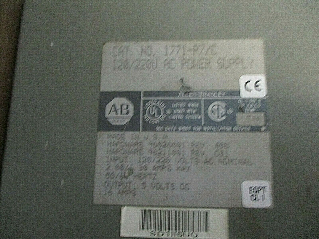 Allen-Bradley Power Supply 1771-P7/C Used_x000D_ Condition: UsedMPN: 1771-P7Brand: Allen-Bradley Allen-Bradley Power Supply 1771-P7/C Used Allen-Bradley Power Supply Part #: 1771-P7/CInput:120/220V2.00/1.30A50/60HzOutput:5V16AUsedLoc: 14E2-34 Allen-Bradley Power Supply Part #: 1771-P7/C Input: 120/220V 2.00/1.30A 50/60Hz Output: 5V 16A Uséd Loc: 14E2-34