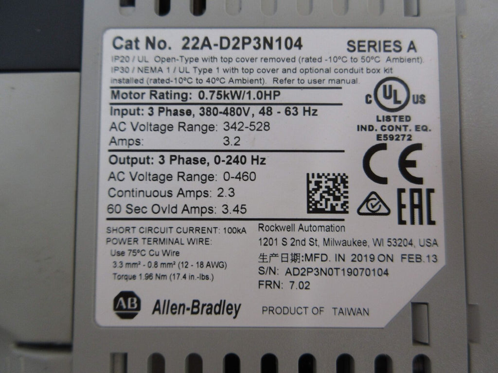 Allen-Bradley PowerFlex 4 AC Drive 22A-D2P3N104 1HP 3Ph Used Allen-Bradley PowerFlex 4 AC Drive Part #: 22A-D2P3N104 1 HP 3Ph Input: 380-480 V 48-63 Hz AC Voltage Range: 342-528 3.2 A Output: 0-240 Hz AC Voltage Range: 0-460 Continuous Amps: 2.3 60 Sec Ovld Amps: 3.45 Used Loc: 50A4-3