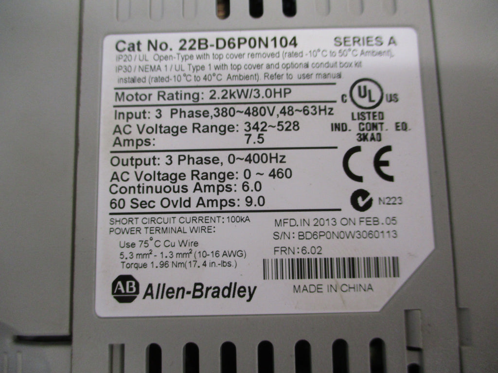 Allen-Bradley PowerFlex 40 AC Drive 22B-D6P0N104 3HP 3Ph Used
