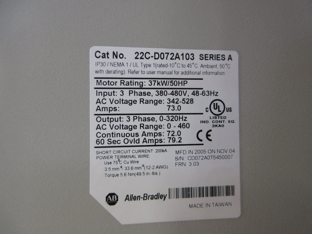Allen-Bradley PowerFlex 400 AC Drive Part #: 22C-D072A103 50...