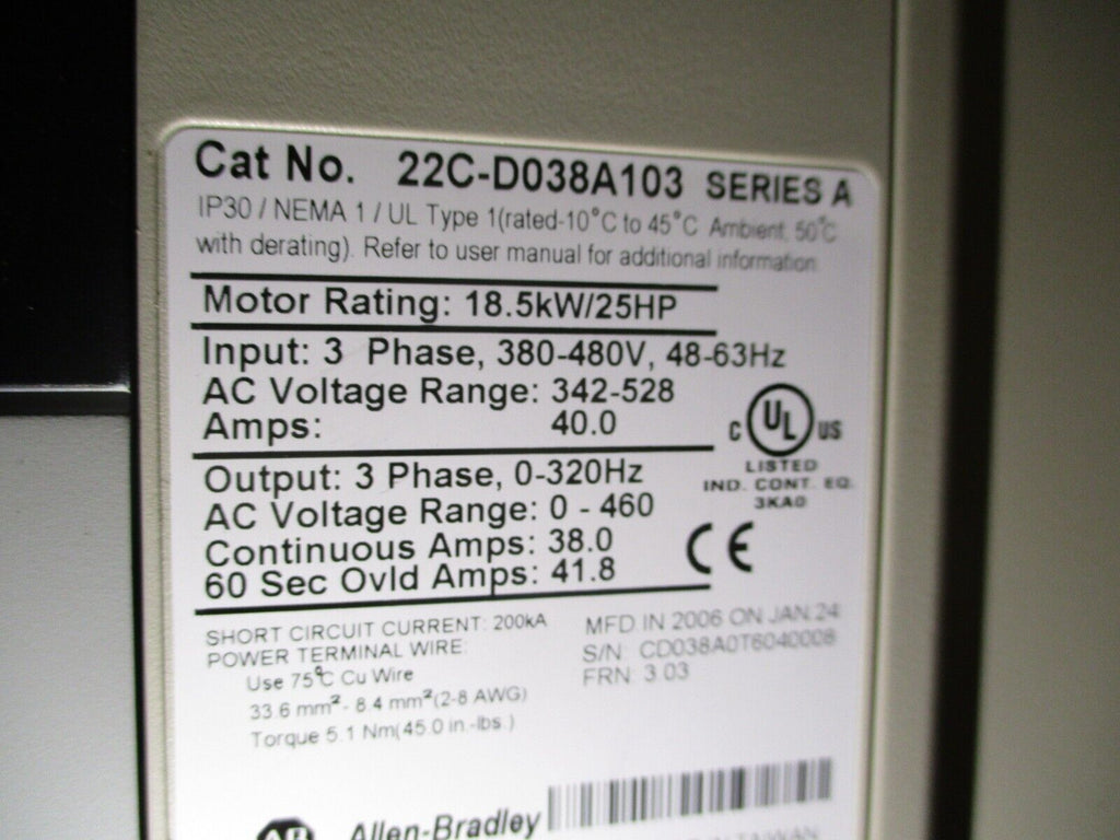 Allen-Bradley PowerFlex 400 AC Drive w/ Bypass 22C-D038A103 Ser. A 25HP 3Ph Used Condition: UsedBrand: Allen-BradleyType: General Purpose AC DriveMaximum Load: 25 HPYear: 2006Model: PowerFlex 400MPN: 22C-D038A103Input Voltage: 480 V Allen-Bradley PowerFlex 400 AC Drive w/ Bypass 22C-D038A103 Ser. A 25HP 3Ph Used Allen-Bradley PowerFlex 400 AC Drive w/ Bypass Part #: 22C-D038A103 Ser. A 25 HP 3Ph Input:380-480 V48-63 HzAC Voltage Range: 342-52840 AOutput:0-320 HzAC Voltage Range: 0-46038 A60 Sec Ovld Amps: 41.8Used Loc: AB11-5215 / AB13L4 Allen-Bradley PowerFlex 400 AC Drive w/ Bypass Part #: 22C-D038A103 Ser. A 25 HP 3Ph Input: 380-480 V 48-63 Hz AC Voltage Range: 342-528 40 A Output: 0-320 Hz AC Voltage Range: 0-460 38 A 60 Sec Ovld Amps: 41.8 Uséd Loc: AB11-5215 / AB40V1