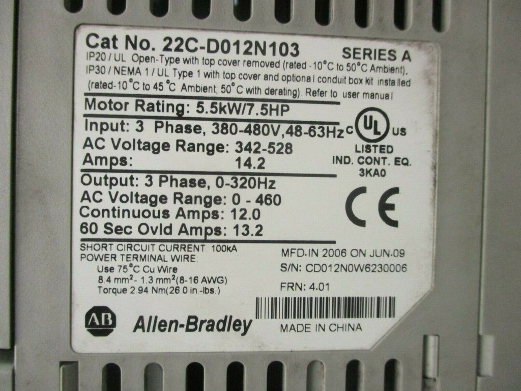 Allen-Bradley PowerFlex 400 AC Drive w/ Bypass 23C-D012A103NNBANN 7.5HP 3Ph Used Condition: UsedMaximum Load: 7.5 HPMPN: 23C-D012A103NNBANNBrand: Allen-Bradley Allen-Bradley PowerFlex 400 AC Drive w/ Bypass 23C-D012A103NNBANN 7.5HP 3Ph Used Allen-Bradley PowerFlex 400 AC Drive w/ Bypass Part #: 23C-D012A103NNBANN 7.5HP 3Ph Drive:Input:380-480V48-63Hz14.2AOutput:0-460V0-320Hz12.0ABypass:Input:460V50/60Hz13.1AOutput:0-460V0-320Hz11AUsedLOC AB4C2-23 Allen-Bradley PowerFlex 400 AC Drive w/ Bypass Part #: 23C-D012A103NNBANN 7.5HP 3Ph Drive: Input: 380-480V 48-63Hz 14.2A Output: 0-460V 0-320Hz 12.0A Bypass: Input: 460V 50/60Hz 13.1A Output: 0-460V 0-320Hz 11A Uséd LOC AB4C2-23