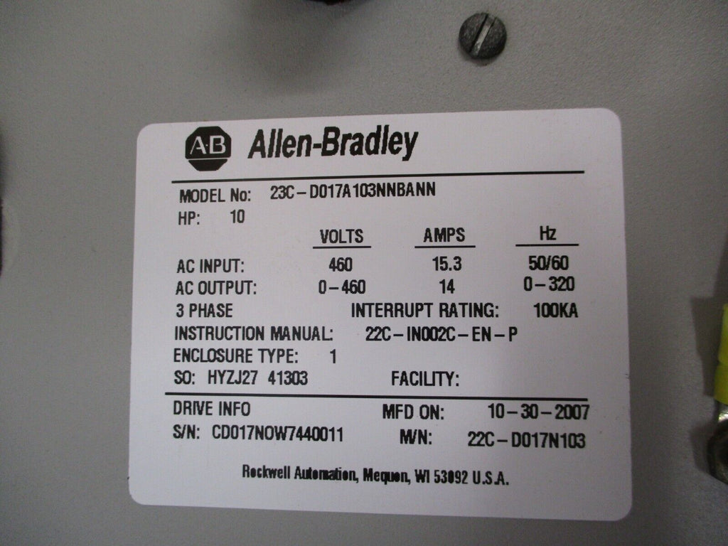 Allen-Bradley PowerFlex 400 AC Drive w/ Bypass 23C-D017A103NNBANN 10HP 3Ph Used_x000D_ Condition: UsedBrand: Allen-BradleyInput Voltage: 460 VMPN: 23C-D017A103NNBANNMaximum Load: 10 HPType: General Purpose AC Drive Allen-Bradley PowerFlex 400 AC Drive w/ Bypass 23C-D017A103NNBANN 10HP 3Ph Used Allen-Bradley PowerFlex 400 AC Drive w/ Bypass Part #: 23C-D017A103NNBANN 10 HP 3Ph Input:460 V15.3 A50/60 HzOutput:0-460 V14 A0-320 HzDims: 41" x 10" x 10"Weighs: 40 LBSUsed Loc: AB11-5940 / AB13P1 Allen-Bradley PowerFlex 400 AC Drive w/ Bypass Part #: 23C-D017A103NNBANN 10 HP 3Ph Input: 460 V 15.3 A 50/60 Hz Output: 0-460 V 14 A 0-320 Hz Dims: 41" x 10" x 10" Weighs: 40 LBS Uséd Loc: AB11-5940 / AB13P1