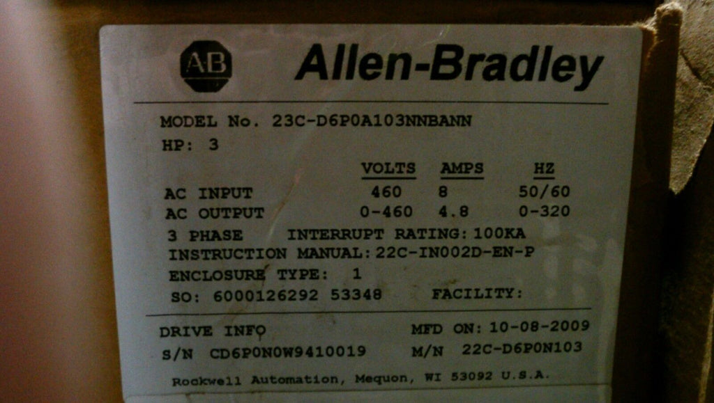 Allen-Bradley PowerFlex 400 AC Drive w/Bypass 23C-D6P0A103NNBANN 3HP New Surplus Condition: New – Open boxMPN: 23C-D6P0A103NNBANNBrand: Allen-Bradley Allen-Bradley PowerFlex 400 AC Drive w/Bypass 23C-D6P0A103NNBANN 3HP New Surplus Allen-Bradley PowerFlex 400 AC Drive w/ Bypass Part #: 23C-D6P0A103NNBANN 3HP 3PhInput:480V8A50/60HzOutput:0-460V4.8A0-320HzNew SurplusLOC AB11-284 / AB4N2 Allen-Bradley PowerFlex 400 AC Drive w/ Bypass Part #: 23C-D6P0A103NNBANN 3HP 3Ph Input: 480V 8A 50/60Hz Output: 0-460V 4.8A 0-320Hz New Surplus LOC AB11-284 / AB4N2