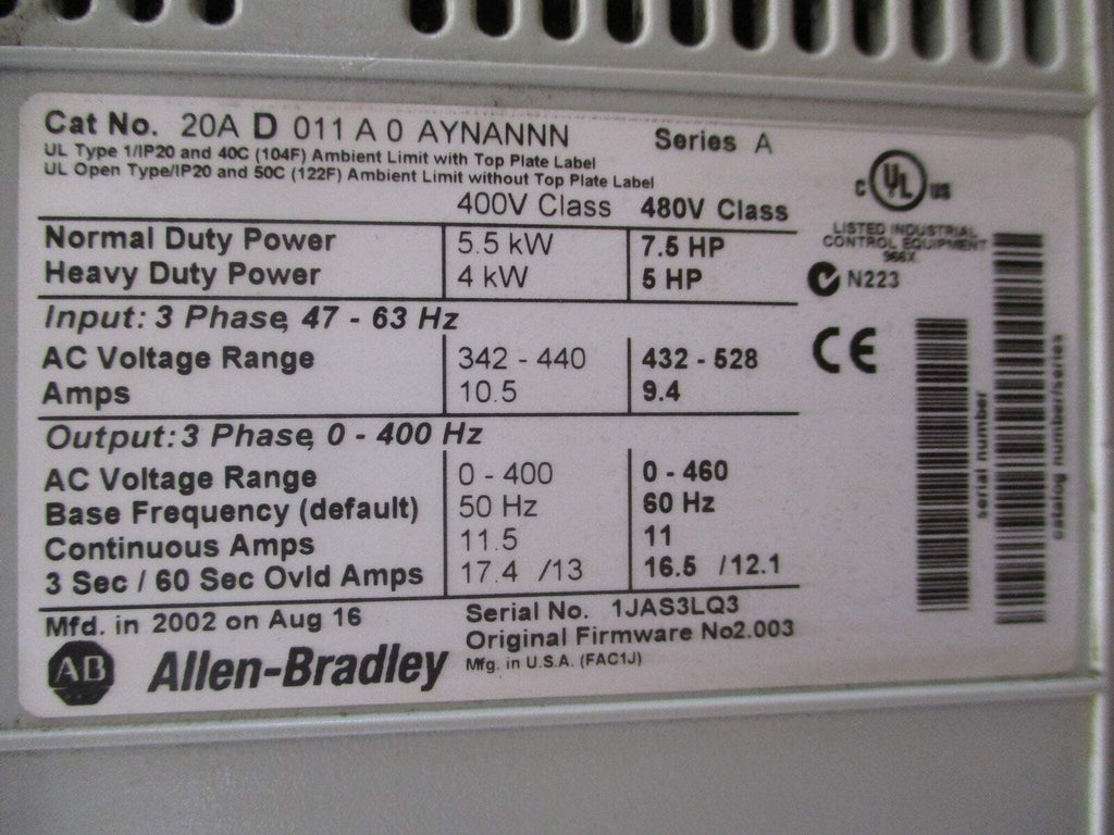 Allen-Bradley PowerFlex 70 AC Drive 20AD011A0AYNANNN 7.5HP 3Ph *No Keypad* Used Allen-Bradley PowerFlex 70 AC Drive Part #: 20AD011A0AYNANNN 7.5 HP 3Ph Input: 47-63 Hz AC Voltage Range: 432-528 9.4 A Output: 0-400 Hz AC Voltage Range: 0-460 Base Frequency (default): 60 Hz Continuous Amps: 11 3 Sec / 60 Sec Ovld Amps: 16.5 / 12.1 *No Keypad* *Missing Cover Screw* Used Loc: 50A1-2