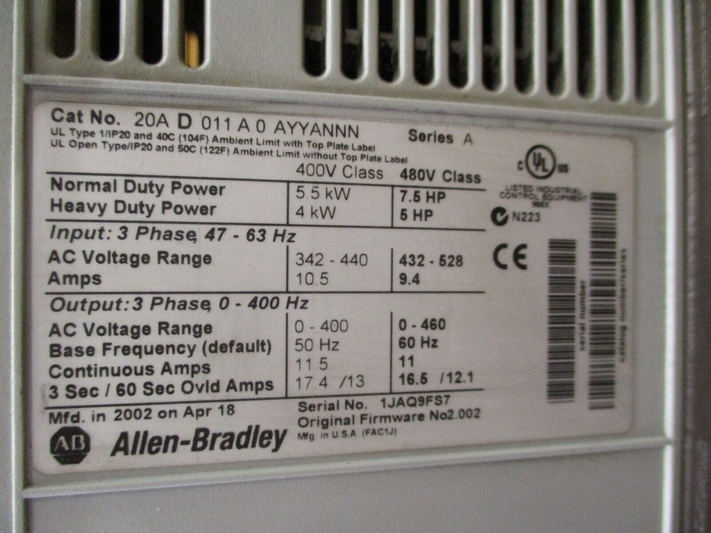 Allen-Bradley PowerFlex 70 AC Drive 20AD011A0AYYANNN 7.5HP 3Ph w/ Keypad Used_x000D_ Condition: UsedBrand: Allen-BradleyInput Voltage: 432-528 VMPN: 20AD011A0AYYANNNMaximum Load: 7.5 HPType: General Purpose AC Drive Allen-Bradley PowerFlex 70 AC Drive 20AD011A0AYYANNN 7.5HP 3Ph w/ Keypad Used Allen-Bradley PowerFlex 70 AC Drive Part #: 20AD011A0AYYANNN 7.5 HP 3Ph Input:47-63 Hz432-528 VAC9.4 AOutput:0-400 Hz0-460 VACBase Frequency (default): 60 Hz11 A3 Sec / 60 Sec Ovld Amps: 16.5 / 12.1w/ Keypad *Missing Cover Screw* Used Loc: 50A3-9 Allen-Bradley PowerFlex 70 AC Drive Part #: 20AD011A0AYYANNN 7.5 HP 3Ph Input: 47-63 Hz 432-528 VAC 9.4 A Output: 0-400 Hz 0-460 VAC Base Frequency (default): 60 Hz 11 A 3 Sec / 60 Sec Ovld Amps: 16.5 / 12.1 w/ Keypad *Missing Cover Screw* Uséd Loc: 50A3-9