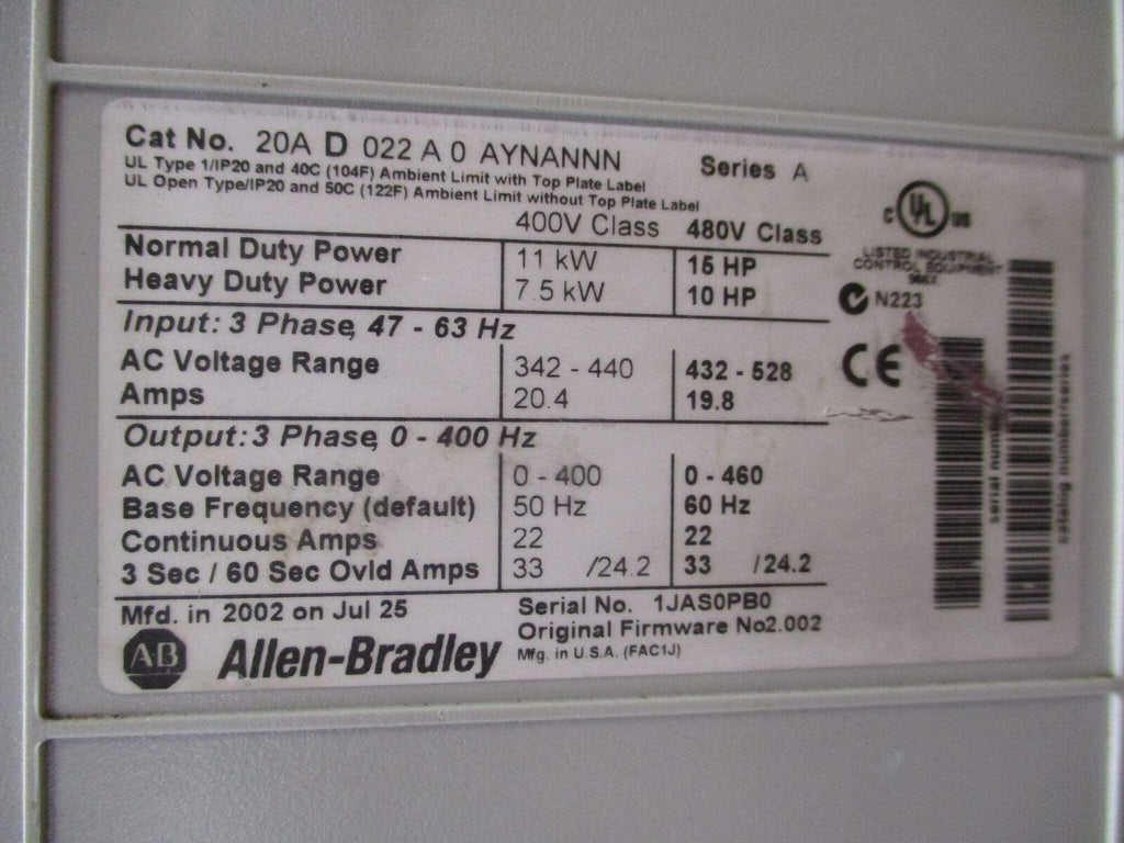 Allen-Bradley PowerFlex 70 AC Drive 20AD022A0AYNANNN 15HP 3Ph w/ Keypad Used Allen-Bradley PowerFlex 70 AC Drive Part #: 20AD022A0AYNANNN 15 HP 3Ph Input: 47-63 Hz AC Voltage Range: 432-528 19.8 A Output: 0-400 Hz AC Voltage Range: 0-460 Base Frequency (default): 60 Hz Continuous Amps: 22 3 Sec / 60 Sec Ovld Amps: 33 / 24.2 w/ Keypad *No Cover Screw* Used Loc: 50A2-11