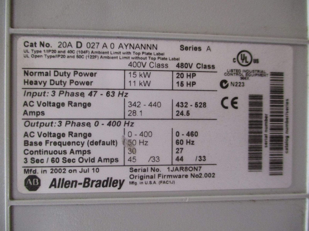 Allen-Bradley PowerFlex 70 AC Drive 20AD027A0AYNANNN 20HP 3Ph *No Keypad* Used Allen-Bradley PowerFlex 70 AC Drive Part #: 20AD027A0AYNANNN 20 HP 3Ph Input: 47-63 Hz AC Voltage Range: 432-528 24.5 A Output: 0-400 Hz AC Voltage Range: 0-460 Base Frequency (default): 60 Hz Continuous Amps: 27 3 Sec / 60 Sec Ovld Amps: 44 / 33 A *No Keypad* Used Loc: 50A2-10