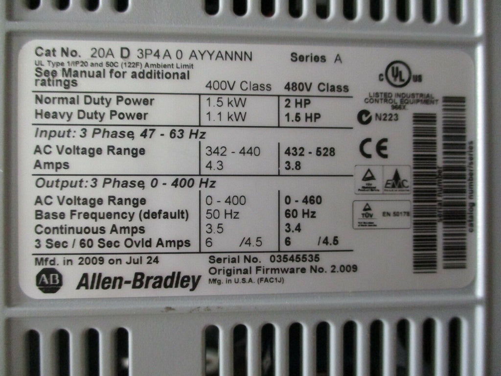 Allen Bradley PowerFlex 70 ACDrive 20AD3P4A0AYYANNN 2HP 3Ph Used Condition: UsedMPN: 20AD3P4A0AYYANNNBrand: Allen-Bradley Allen Bradley PowerFlex 70 ACDrive 20AD3P4A0AYYANNN 2HP 3Ph Used Allen Bradley PowerFlex 70 AC Drive Part # 20AD3P4A0AYYANNN 2HP 3PhInput: 47-63Hz342-440V4.3AOutput:0-400Hz0-400V3.5A UsedLOC 13D1-11 Allen Bradley PowerFlex 70 AC Drive Part # 20AD3P4A0AYYANNN 2HP 3Ph Input: 47-63Hz 342-440V 4.3A Output: 0-400Hz 0-400V 3.5A Uséd LOC 13D1-11