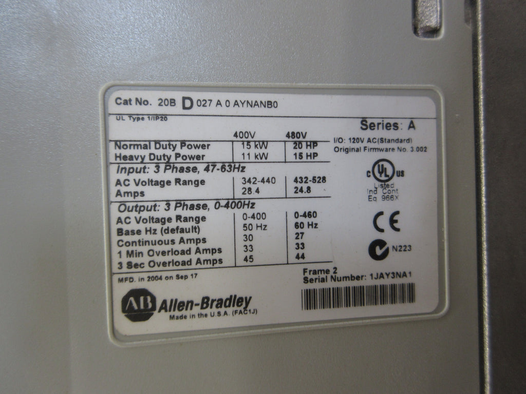 Allen-Bradley PowerFlex 700 AC Drive Part #: 20BD027A0AYNANB0 20 HP 3Ph Input: 47-63 Hz AC Voltage Range: 432-528 24.8 A Output: 0-400 Hz AC Voltage Range: 0-460 Base Hz (default): 60 Hz Continuous Amps: 27 1 Min Overload Amps: 33 3 Sec Overload Amps: 44 w/ Keypad Used Loc: 50A1-6