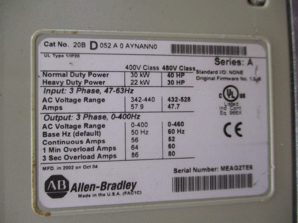 Allen-Bradley PowerFlex 700 AC Drive 20BD052A0AYNANN0 40HP 3Ph *No Keypad* Used Allen-Bradley PowerFlex 700 AC Drive Part #: 20BD052A0AYNANN0 40 HP 3Ph Input: 47-63 Hz AC Voltage Range: 432-528 47.7 A Output: 0-400 Hz AC Voltage Range: 0-460 Base Hz (default): 60 Hz Continuous Amps: 52 1 Min Overload Amps: 60 3 Sec Overload Amps: 80 *No Keypad* Dims: 21" x 9" x 8" Weighs: 45 LBS Used Loc: AB11-8038 / AB6K3