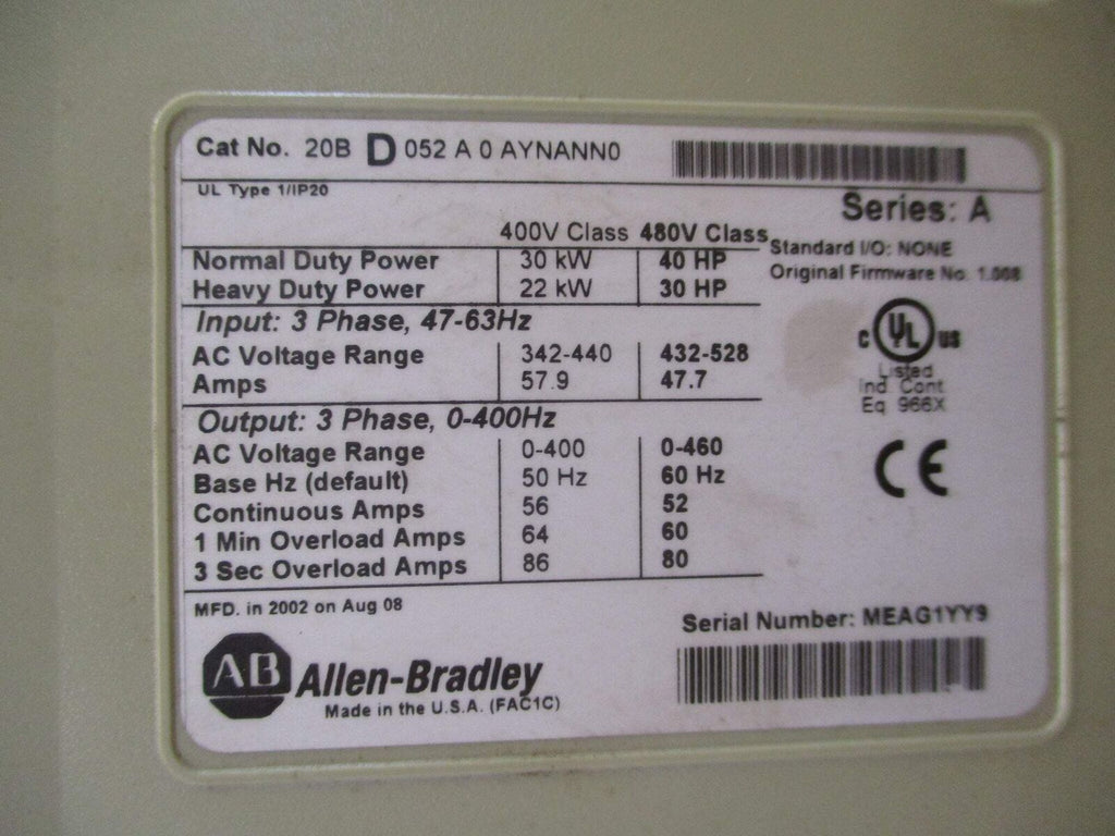 Allen-Bradley PowerFlex 700 AC Drive 20BD052A0AYNANN0 40HP 3Ph w/ Keypad Used Allen-Bradley PowerFlex 700 AC Drive Part #: 20BD052A0AYNANN0 40 HP 3Ph Input: 47-63 Hz AC Voltage Range: 432-528 47.7 A Output: 0-400 Hz AC Voltage Range: 0-460 Base Hz (default): 60 Hz Continuous Amps: 52 1 Min Overload Amps: 60 3 Sec Overload Amps: 80 w/ Keypad Dims: 21" x 9" x 8" Weighs: 45 LBS Used Loc: AB11-8039 / AB6K3