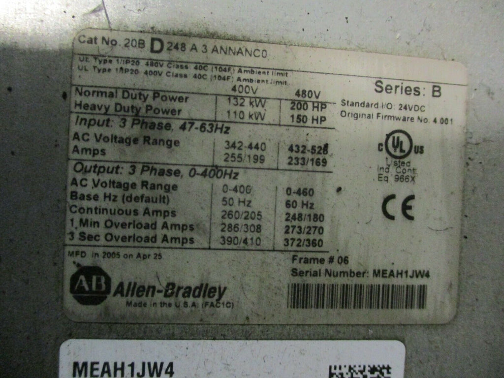 Allen-Bradley PowerFlex 700 AC Drive Part #: 20BD248A3ANNANC0 Ser. B 200 HP 3Ph Input: 47-63 Hz AC Voltage Range: 432-528 233/169 A Output: 0-400 Hz AC Voltage Range: 0-460 Base Hz (default): 60 Hz Continuous Amps: 248/180 w/ Keypad Used Loc: AB11-3496 / (AB38M3)