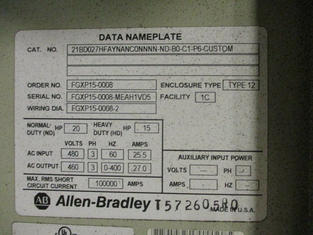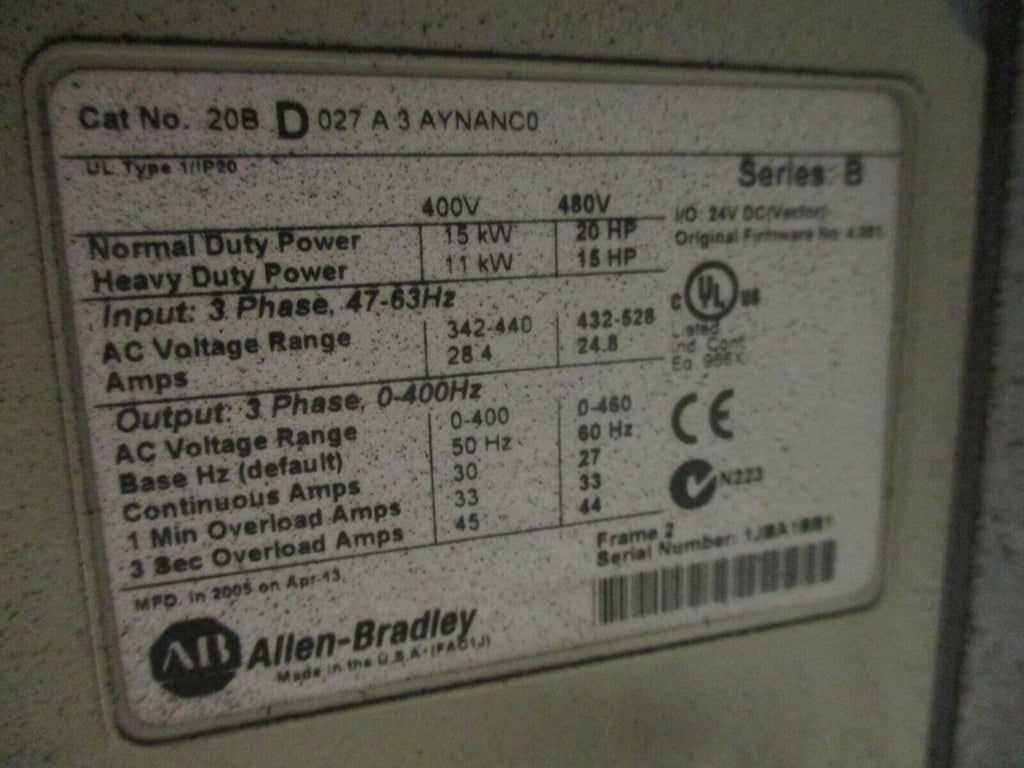 Allen-Bradley PowerFlex 700 AC Drive w/ Nema 12 Enclosure 20HP 3Ph Used Condition: Used Model: PowerFlex 700 Brand: Allen-Bradley Type: General Purpose AC Drive Maximum Load: 20 HP Input Voltage: 480 V MPN: 21BD027HFAYNANC0NNNN-ND-B0-C1-P6-CUSTOM Allen-Bradley PowerFlex 700 AC Drive w/ Nema 12 Enclosure 20HP 3Ph Used Allen-Bradley PowerFlex 700 AC Drive w/ Nema 12 Enclosure Part #: 21BD027HFAYNANC0NNNN-ND-B0-C1-P6-CUSTOM Drive Part #: 20BD027A3AYNANC0 20HP 3Ph Input: 480V 60Hz 25.5A Output: 460V 0-400Hz 27.0A w/ Keypad Used LOC AB11-3497 / (AB6Q3) Allen-Bradley PowerFlex 700 AC Drive w/ Nema 12 Enclosure Part #: 21BD027HFAYNANC0NNNN-ND-B0-C1-P6-CUSTOM Drive Part #: 20BD027A3AYNANC0 20HP 3Ph Input: 480V 60Hz 25.5A Output: 460V 0-400Hz 27.0A w/ Keypad Uséd LOC AB11-3497 / (AB6I4)