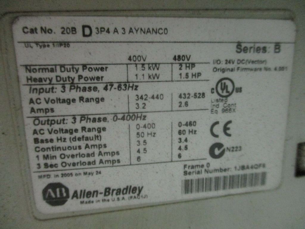 Allen-Bradley PowerFlex 700 AC Drive w/ Nema 12 Enclosure 2HP 3Ph 480V Used Condition: UsedModel: PowerFlex 700Brand: Allen-BradleyType: General Purpose AC DriveMaximum Load: 2 HPInput Voltage: 480 VMPN: 21BD3P4HFAYNANC0NNNN-ND-B0-C1-P6-CUSTOM Allen-Bradley PowerFlex 700 AC Drive w/ Nema 12 Enclosure 2HP 3Ph 480V Used Allen-Bradley PowerFlex 700 AC Drive w/ Nema 12 Enclosure Part #: 21BD3P4HFAYNANC0NNNN-ND-B0-C1-P6-CUSTOM Drive Part #: 20BD3P4A3AYNANC0 2HP 3Ph Input: 480V 60Hz 3.3A Output: 460V 0-400Hz 3.4A w/ Keypad Used LOC AB11-3500 / (AB39C4) Allen-Bradley PowerFlex 700 AC Drive w/ Nema 12 Enclosure Part #: 21BD3P4HFAYNANC0NNNN-ND-B0-C1-P6-CUSTOM Drive Part #: 20BD3P4A3AYNANC0 2HP 3Ph Input: 480V 60Hz 3.3A Output: 460V 0-400Hz 3.4A w/ Keypad Uséd LOC AB11-3500 / (AB39C4)