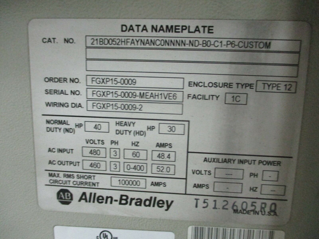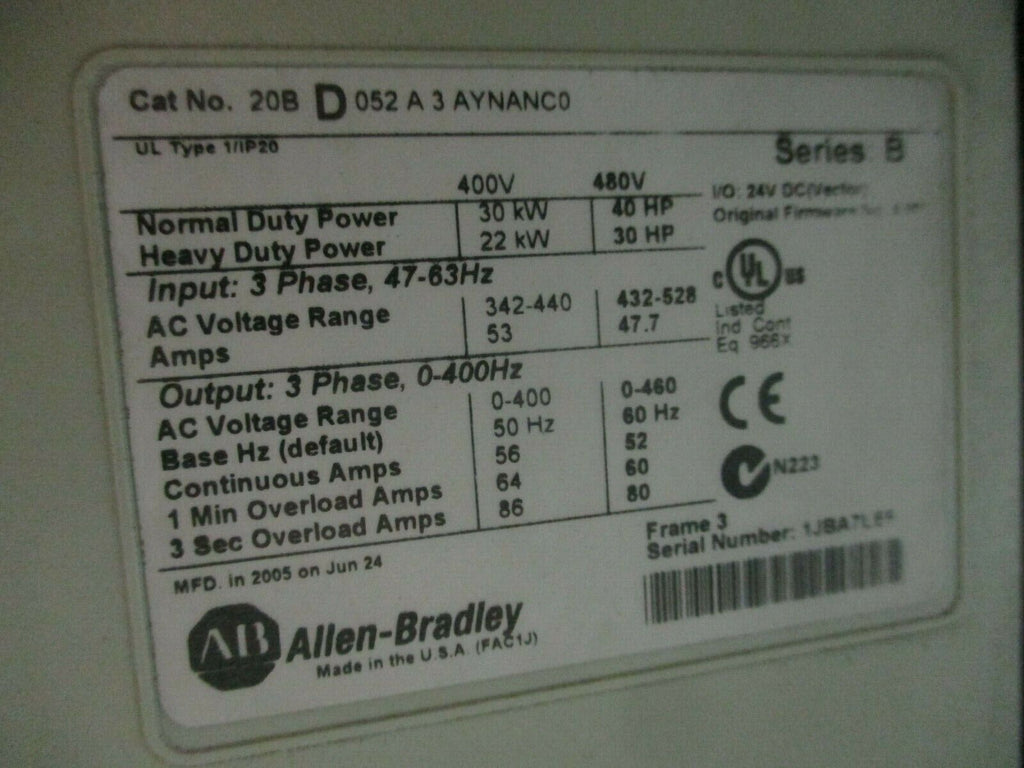 Allen-Bradley PowerFlex 700 AC Drive w/ Nema 12 Enclosure 40HP 3Ph 480V Used Condition: UsedModel: AC DriveBrand: Allen-BradleyType: General Purpose AC DriveMaximum Load: 40 HPInput Voltage: 480 VMPN: 21BD052HFAYNANC0NNNN-ND-B0-C1-P6-CUSTOM Allen-Bradley PowerFlex 700 AC Drive w/ Nema 12 Enclosure 40HP 3Ph 480V Used Allen-Bradley PowerFlex 700 AC Drive w/ Nema 12 Enclosure Part #: 21BD052HFAYNANC0NNNN-ND-B0-C1-P6-CUSTOM Drive Part #: 20BD052A3AYNANC0 40HP 3Ph Input: 480V 60Hz 48.4A Output: 460V 0-400Hz 52.0A w/ Keypad Used LOC AB11-3498 / (AB38E4) Allen-Bradley PowerFlex 700 AC Drive w/ Nema 12 Enclosure Part #: 21BD052HFAYNANC0NNNN-ND-B0-C1-P6-CUSTOM Drive Part #: 20BD052A3AYNANC0 40HP 3Ph Input: 480V 60Hz 48.4A Output: 460V 0-400Hz 52.0A w/ Keypad Uséd LOC AB11-3498 / (AB38E4)