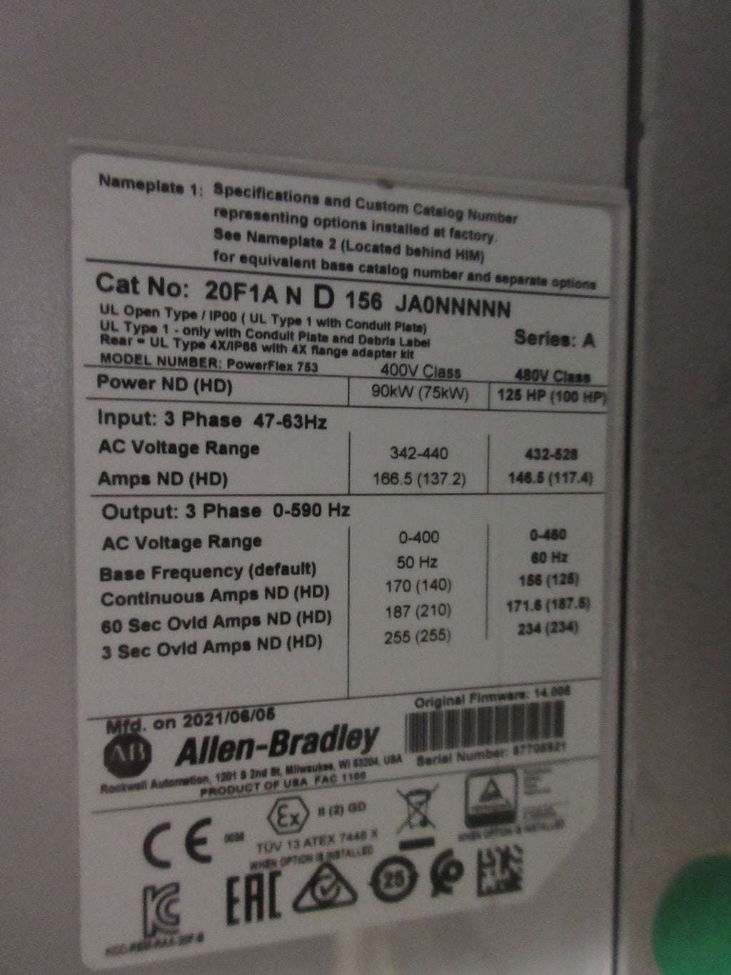 Allen-Bradley PowerFlex 753 AC Drive Part #: 20F1AND156JA0NNNNN 125 HP 3Ph Input: 47-63 Hz AC Voltage Range: 432-528 146.5 A Output: 0-590 Hz AC Voltage Range: 0-480 Base Frequency (default) 60 Hz Continuous Amps: 156 60 Sec Ovld Amps: 171.6 3 Sec Ovld Amps: 234 Dims: 40" x 13" x 14" Weighs: 130 LBS w/ Keypad Used Loc: AB11-9111