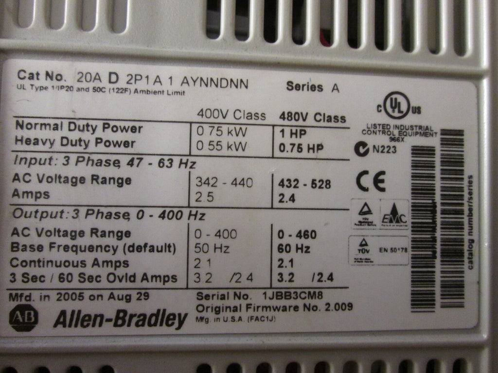 Allen-Bradley PowerFlex70 AC Drive 20A D 2P1A 1 AYNNDNN 1HP 3Ph Used_x000D_ Condition: UsedBrand: Allen-BradleyMPN: 20A D 2P1A 1 AYNNDNN Allen-Bradley PowerFlex70 AC Drive 20A D 2P1A 1 AYNNDNN 1HP 3Ph Used Allen-Bradley PowerFlex70 AC Drive Part # 20A D 2P1A 1 AYNNDNN 1HP 3Ph Input:47-63HzVoltage Range 432-5282.4AOutput:0-400HzVoltage Range 0-460Base Freq 60HzCont A 2.1UsedLOC 14F1-2 Allen-Bradley PowerFlex70 AC Drive Part # 20A D 2P1A 1 AYNNDNN 1HP 3Ph Input: 47-63Hz Voltage Range 432-528 2.4A Output: 0-400Hz Voltage Range 0-460 Base Freq 60Hz Cont A 2.1 Uséd LOC 14F1-2