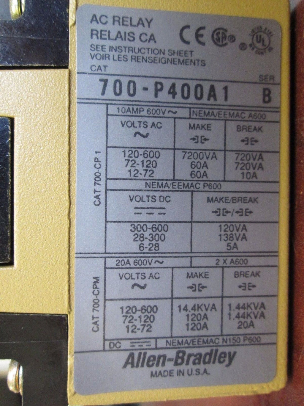 Allen-Bradley Relay 700-P400A1 115-120V Coil *Lot of 2* Used Condition: UsedMPN: 700-P400A1Brand: Allen-Bradley Allen-Bradley Relay 700-P400A1 115-120V Coil *Lot of 2* Used Allen-Bradley Relay Part #: 700-P400A1 115-120V Coil *Lot of 2* UsedLOC 4L3-25 / 12D4-39 Allen-Bradley Relay Part #: 700-P400A1 115-120V Coil *Lot of 2* Uséd LOC 4L3-25 / 12D4-39