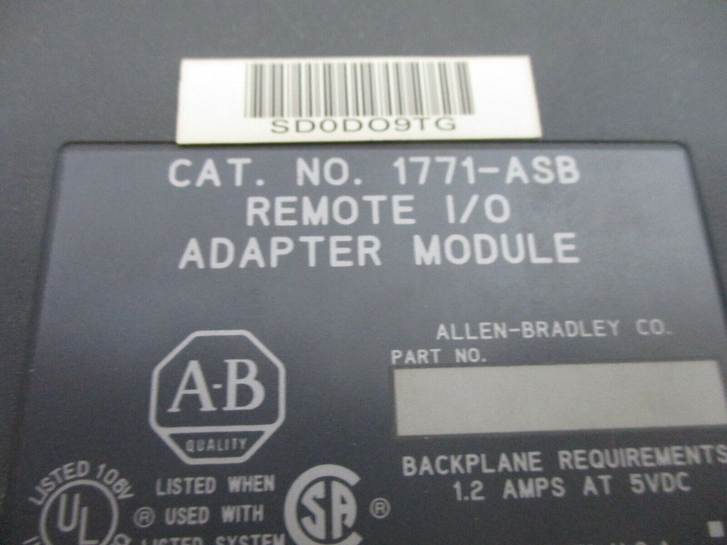Allen-Bradley Remote I/O Adapter Module 1771-ASB Ser. A F/W Rev. B Used Condition: UsedMPN: 1771-ASBBrand: Allen-BradleyType: PLC Input/output Module Allen-Bradley Remote I/O Adapter Module 1771-ASB Ser. A F/W Rev. B Used Allen-Bradley Remote I/O Adapter Module Part#: 1771-ASB Ser. A F/W Rev. B *Broken Terminal Clip* Used loc: 11I3-62 Allen-Bradley Remote I/O Adapter Module Part#: 1771-ASB Ser. A F/W Rev. B *Broken Terminal Clip* Uséd loc: 11I3-62