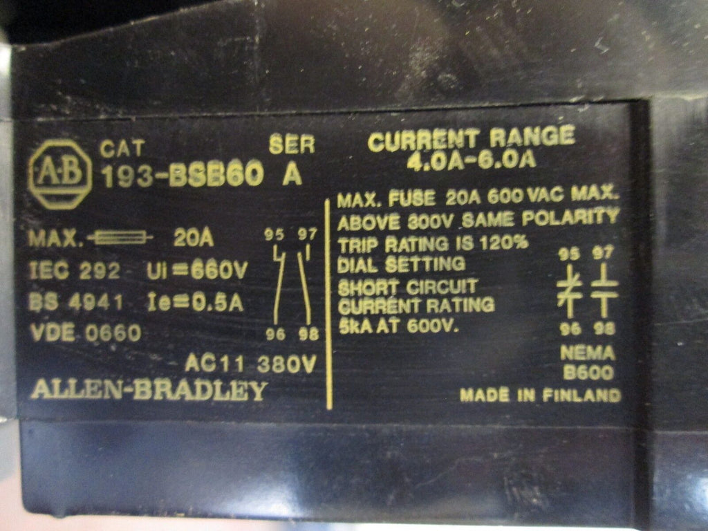 Allen-Bradley Reversing Contactor 100-A09ND3 w/ 193-BSB60 Overload Relay Used Condition: UsedBrand: Allen-BradleyModel: Reversing ContactorMPN: 100-A09ND3 Allen-Bradley Reversing Contactor 100-A09ND3 w/ 193-BSB60 Overload Relay Used Allen-Bradley Reversing Contactor Part #: 100-A09ND3 w/ 193-BSB60 Overload Relay 9A600V120V CoilUsedLOC 15G3-4 Allen-Bradley Reversing Contactor Part #: 100-A09ND3 w/ 193-BSB60 Overload Relay 9A 600V 120V Coil Uséd LOC 15G3-4