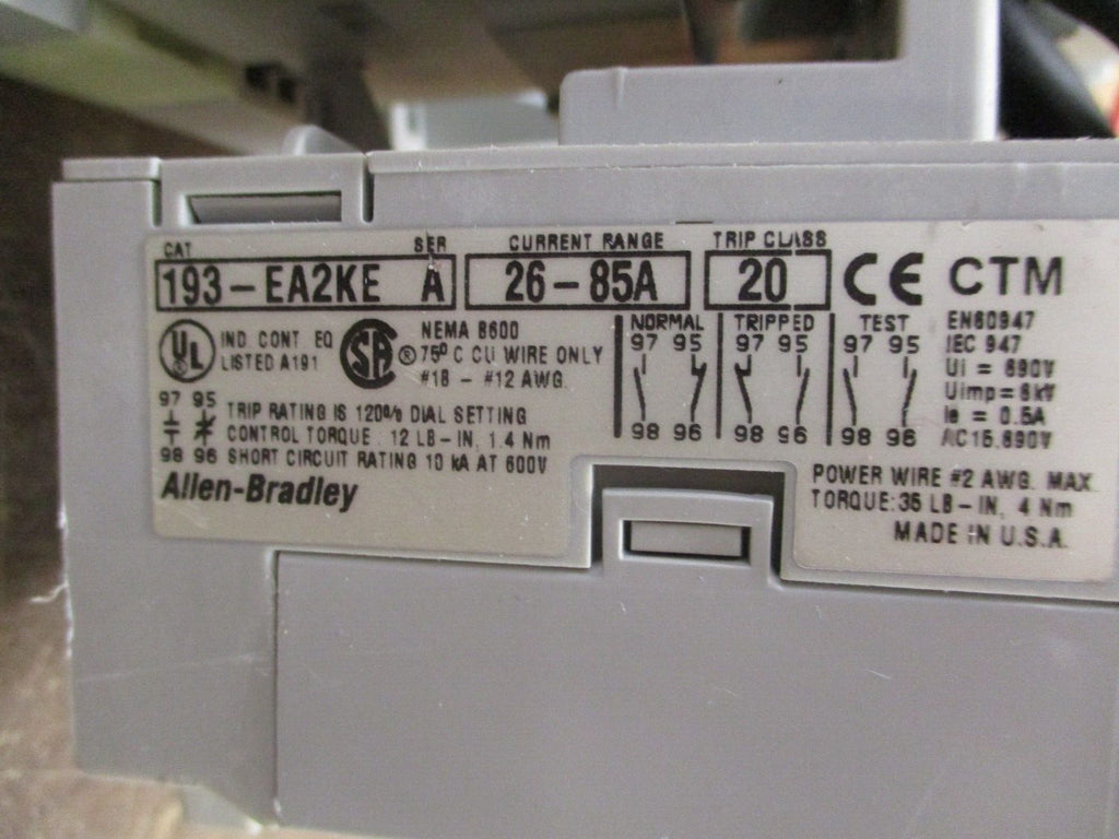 Allen-Bradley Reversing Starter 100-C72*00 / 193-EA2KE 120V Coil Trip: 26-85A Allen-Bradley Reversing Starter Part #: 100-C72*00 / 193-EA2KE 120 V Coil Trip: 26-85 A 600 V w/ (2) Aux Contact Blocks UsedLoc: 14B2-50 Allen-Bradley Reversing Starter Part #: 100-C72*00 / 193-EA2KE 120 V Coil Trip: 26-85 A 600 V w/ (2) Aux Contact Blocks UsédLoc: 14B2-50