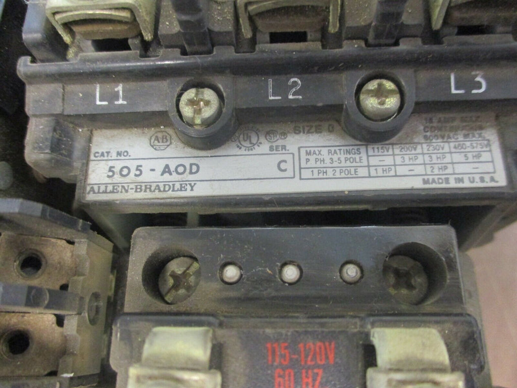 Allen-Bradley Size 0 Reversing Starter 505-AOD Ser. C 120V Coil 18A 600V Used_x000D_ Condition: UsedMPN: 505-AODBrand: Allen-Bradley Allen-Bradley Size 0 Reversing Starter 505-AOD Ser. C 120V Coil 18A 600V Used Allen-Bradley Size 0 Reversing Starter Part #: 505-AOD Ser. C 120V Coil 18A 600V UsedLOC 16H4-35 Allen-Bradley Size 0 Reversing Starter Part #: 505-AOD Ser. C 120V Coil 18A 600V Uséd LOC 16H4-35