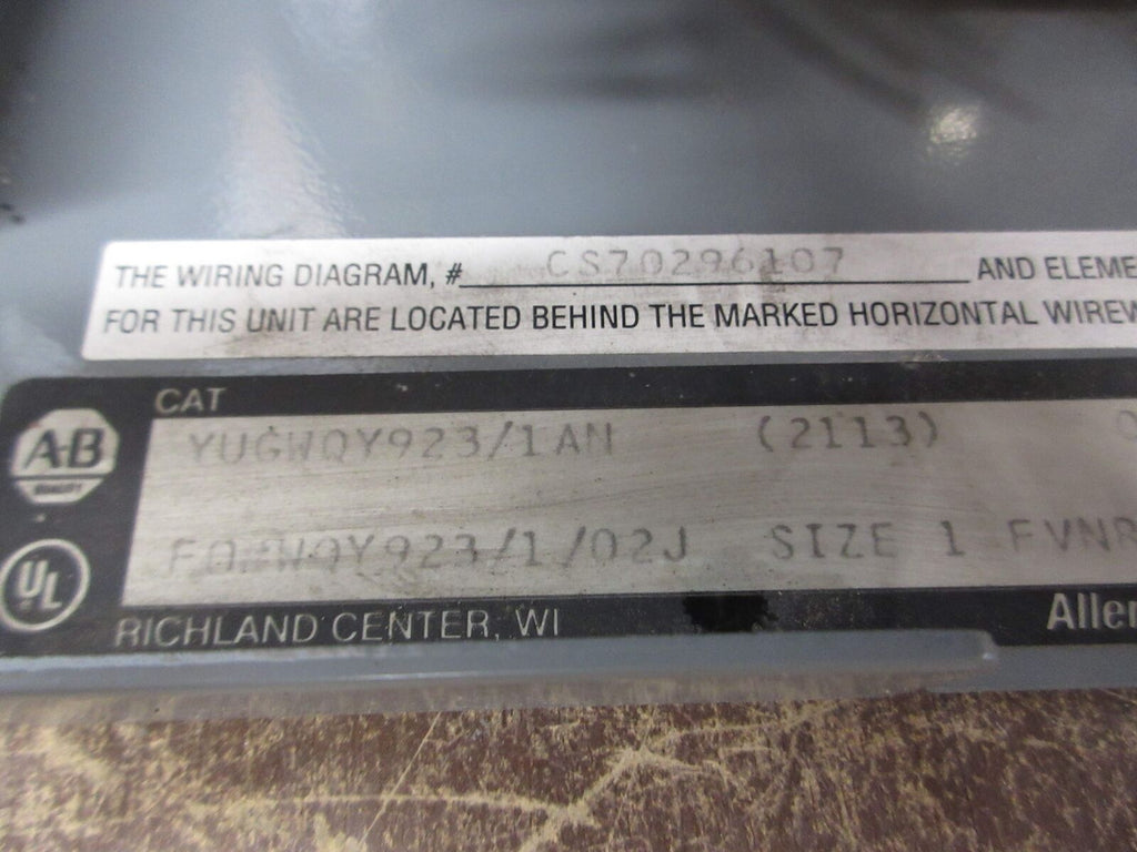 Allen-Bradley Size 1 MCC Bucket YUGWQY923/1AN 480V 3Ph 60Hz 12...