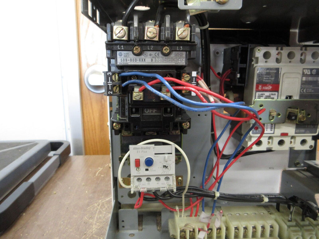 Allen-Bradley Size 1 MCC Bucket YUGWQY923/1AV 480V 3Ph 60Hz 120V Coil w/ Door Allen-Bradley Size 1 MCC Bucket Part #: YUGWQY923/1AV 480 V 3Ph 60 Hz 120 V Coil Contactor: 509-BOD-XXX Overload: 592-EEDC Breaker: HMCP015B0C w/ Door *No Shelf* *No Door Hinge Pins* Used Loc: AB11-8189 / AB29C6