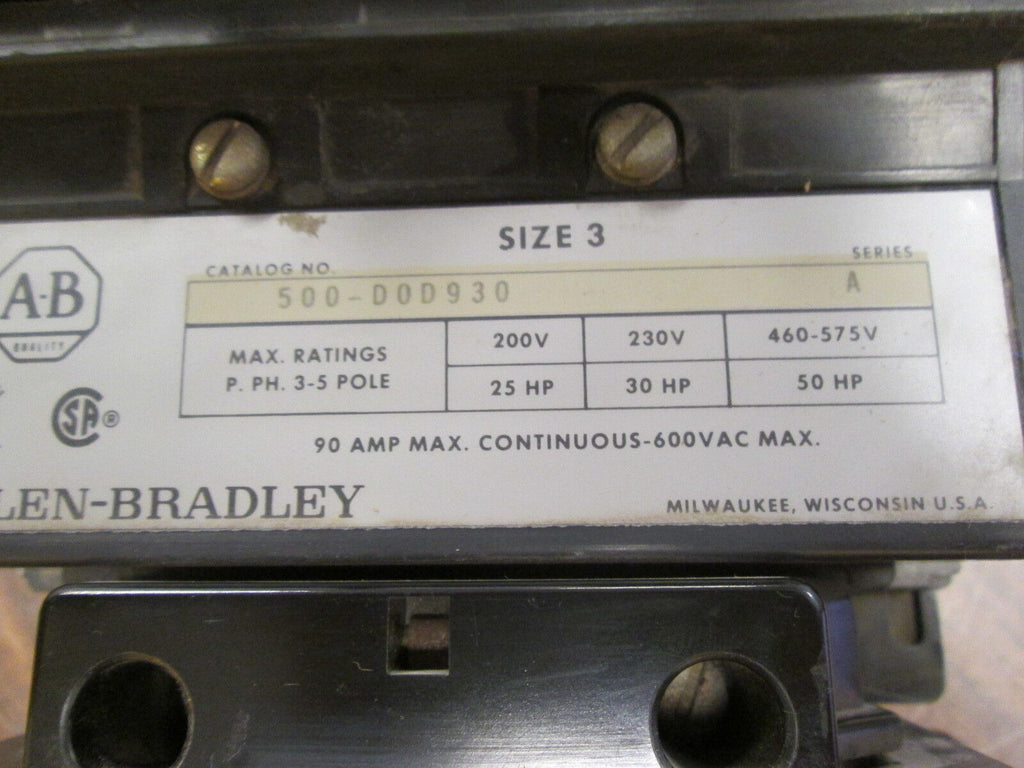 Allen-Bradley Size 3 Starter 500-D0D930 90A 600V 115-120V Coil Used_x000D_ Condition: UsedMPN: 500-D0D930Brand: Allen-Bradley Allen-Bradley Size 3 Starter 500-D0D930 90A 600V 115-120V Coil Used Allen-Bradley Size 3 StarterPart #: 500-D0D930 90A 600V 115-120V Coil UsedLOC AB3K1-10 / AB40N3 Allen-Bradley Size 3 Starter Part #: 500-D0D930 90A 600V 115-120V Coil Uséd LOC AB3K1-10 / AB40N3