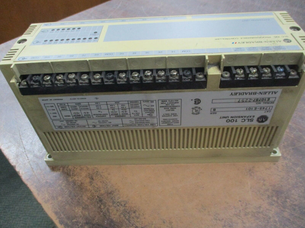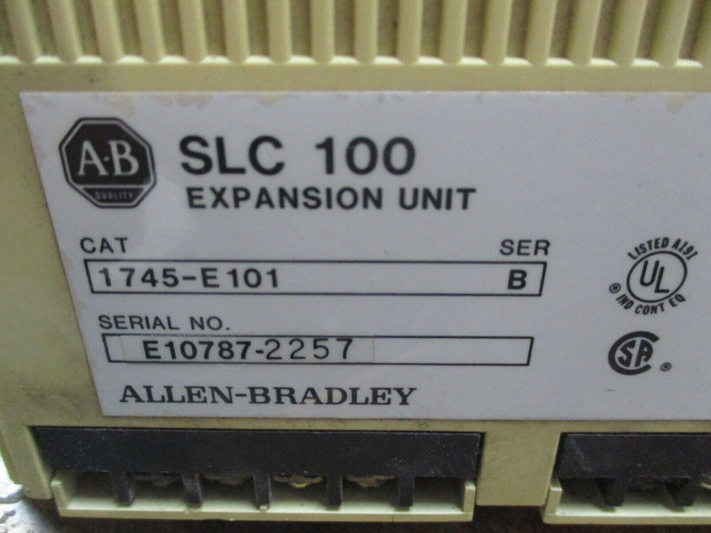 Allen-Bradley SLC 100 Expansion Unit 1745-E101 Ser. B Used_x000D_ Condition: UsedController Platform: SLC 100/150MPN: 1745-E101Brand: Allen-Bradley Allen-Bradley SLC 100 Expansion Unit 1745-E101 Ser. B Used Allen-Bradley SLC 100 Expansion Unit Part #: 1745-E101Ser. B Used*Missing (1) Terminal Cover***(1) Cracked Mounting Foot**LOC 11C4-39 Allen-Bradley SLC 100 Expansion Unit Part #: 1745-E101 Ser. B Uséd *Missing (1) Terminal Cover* **(1) Cracked Mounting Foot** LOC 11C4-39