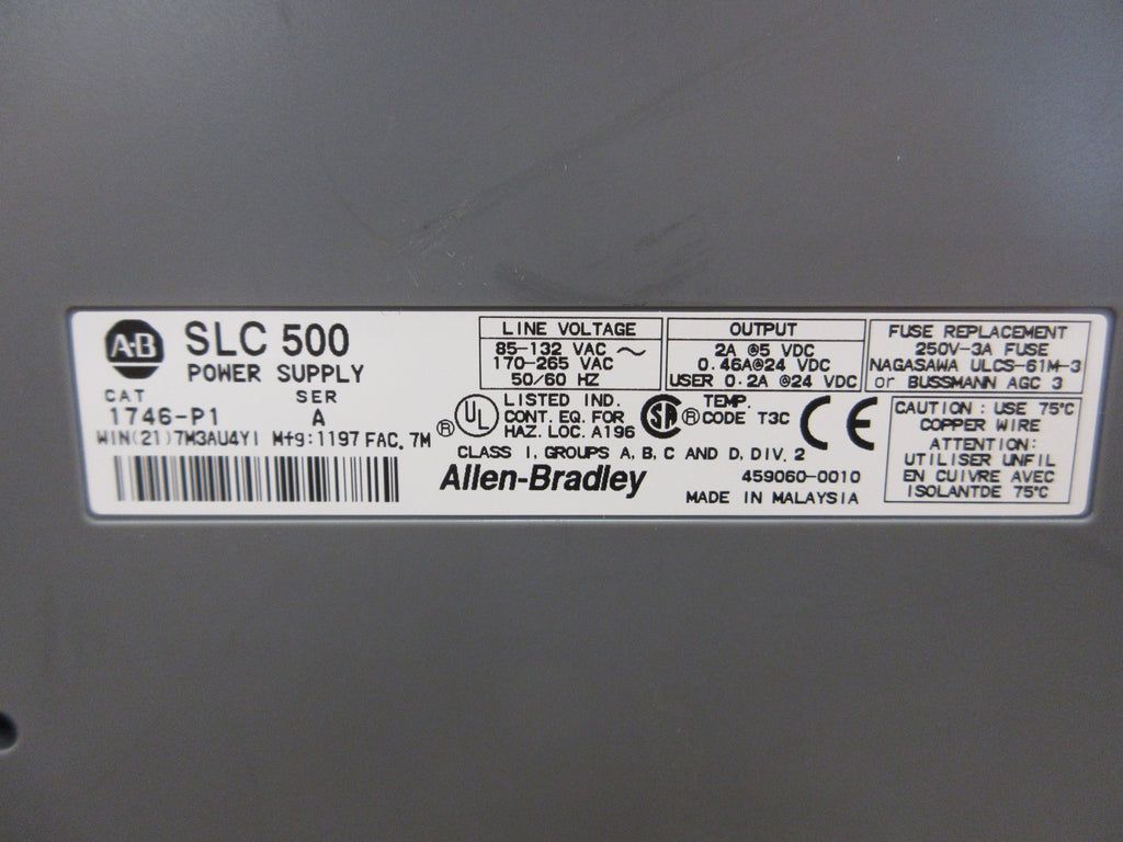 Allen-Bradley SLC 500 PLC Rack w/ Power Supply Part #: 1746-A7 / 1746-P1 7-Slot Line: 85-132V ~ 170-256V 50/60Hz Output: 2A @ 5VDC 0.46 @ 24VDC Used Loc: 57G3-7