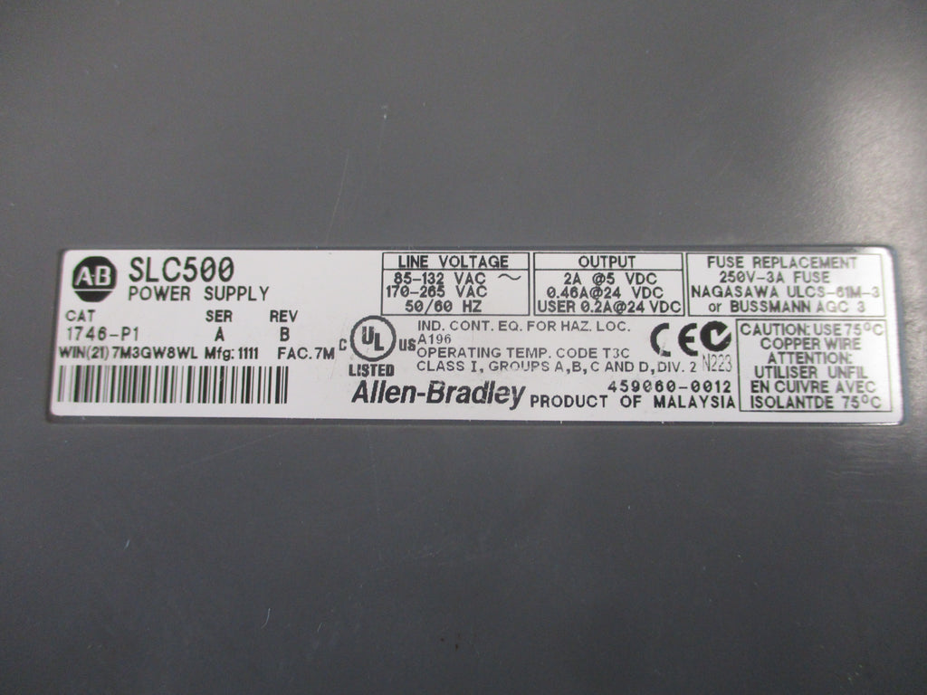 Allen-Bradley SLC 500 Power Supply 1746-P1 Ser. A Rev. B Input: 85-132VAC 170-265VAC 50/60Hz Output: 2A @5VDC 0.46A@24VDC USER 0.2@24VDC Used LOC 56D3-10