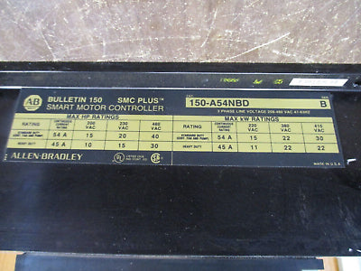 Allen-Bradley SMC Plus Soft Start 150-A54NBD Ser. B 40HP 208-480V 3Ph 54A Used_x000D_ Condition: UsedBrand: Allen-BradleyInput Voltage: 208-480 VMPN: 150-A54NBDRated Load: 40 HP Allen-Bradley SMC Plus Soft Start 150-A54NBD Ser. B 40HP 208-480V 3Ph 54A Used Allen-Bradley SMC Plus Soft Start Part #: 150-A54NBD Ser. B 40 HP 208-480 V 3Ph 54 A47-63 Hz*Missing (3) Lug Screw*Used Loc: AB11-5977 / AB1O2 Allen-Bradley SMC Plus Soft Start Part #: 150-A54NBD Ser. B 40 HP 208-480 V 3Ph 54 A 47-63 Hz *Missing (3) Lug Screw* Uséd Loc: AB11-5977 / AB1O2
