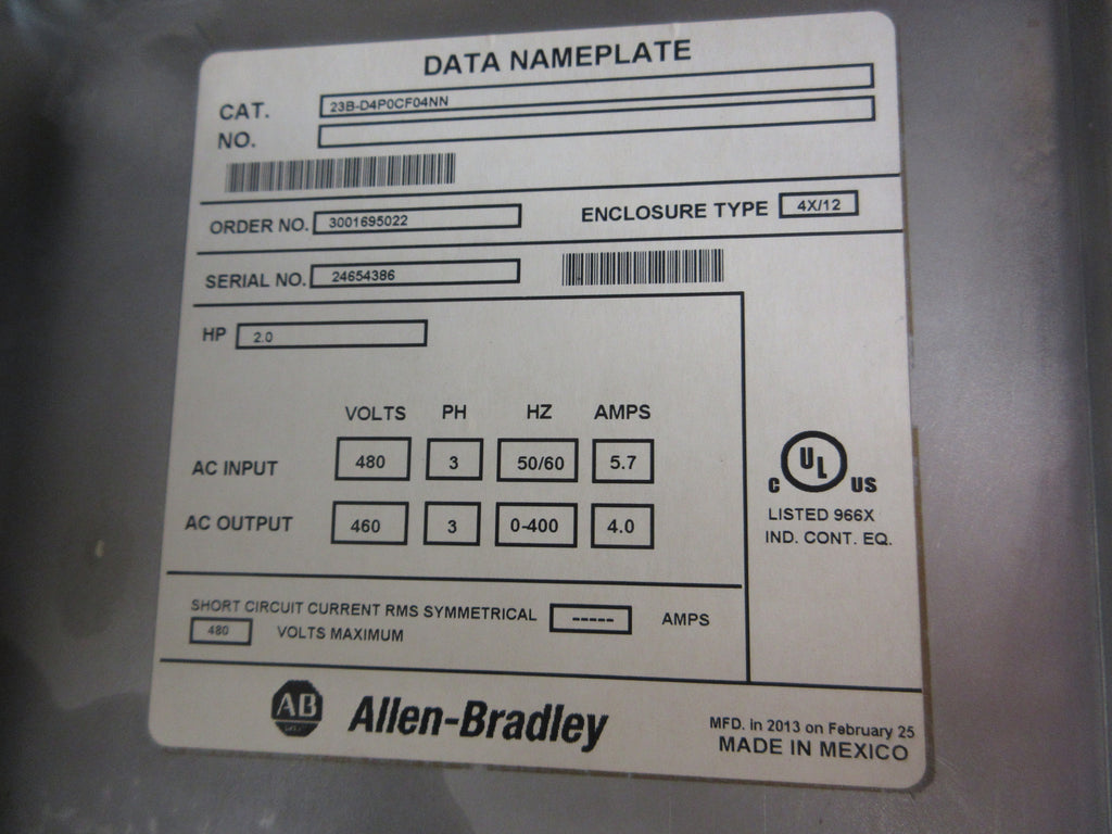 Allen-Bradley Stainless Steel PowerFlex 40 AC Drive Part #: 23B-D4P0CF04NN 2 HP 3Ph Input: 480 V 50/60 Hz 5.7 A Output: 460 V 0-400 Hz 4 A Type 4X/12 Enclosure Used Loc: AB11-9073 / AB8E1