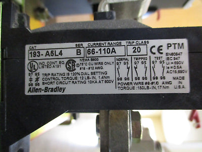 Allen-Bradley Starter 100-B110N*3 / 193-A5L4 120V Coil Trip: 66-110A 600V Used
