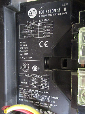 Allen-Bradley Starter 100-B110N*3 / 193-A5L4 120V Coil Trip: 66-110A 600V Used_x000D_ Condition: UsedBrand: Allen-BradleyMPN: 100-B110N*3 / 193-A5L4 Allen-Bradley Starter 100-B110N*3 / 193-A5L4 120V Coil Trip: 66-110A 600V Used Allen-Bradley Starter Part #: 100-B110N*3 / 193-A5L4 120 V Coil Trip: 66-110 A 600 V*Missing (4) Mounting Screws* Used Loc: 27E5-7 Allen-Bradley Starter Part #: 100-B110N*3 / 193-A5L4 120 V Coil Trip: 66-110 A 600 V *Missing (4) Mounting Screws* Uséd Loc: 27E5-7