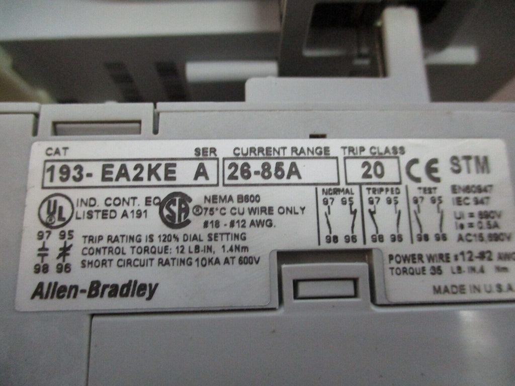 Allen-Bradley Starter 100-C60*00/193-EA2KE 120V Coil Trip: 26-85A 600V Used_x000D_ Condition: UsedBrand: Allen-BradleyMPN: 100-C60*00 / 193-EA2KEType: Starter Allen-Bradley Starter 100-C60*00/193-EA2KE 120V Coil Trip: 26-85A 600V Used Allen-Bradley Starter Part #: 100-C60*00 / 193-EA2KE 120 V Coil Trip: 26-85 A 600 V w/ Aux Contact Blockw/ Aux ContactUsed Loc: 25E2-13 Allen-Bradley Starter Part #: 100-C60*00 / 193-EA2KE 120 V Coil Trip: 26-85 A 600 V w/ Aux Contact Block w/ Aux Contact Uséd Loc: 25E2-13