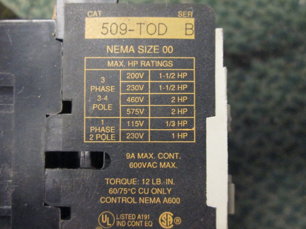 Allen-Bradley Starter 509-TOD Size 00 9A 600V 120V Coil Used_x...