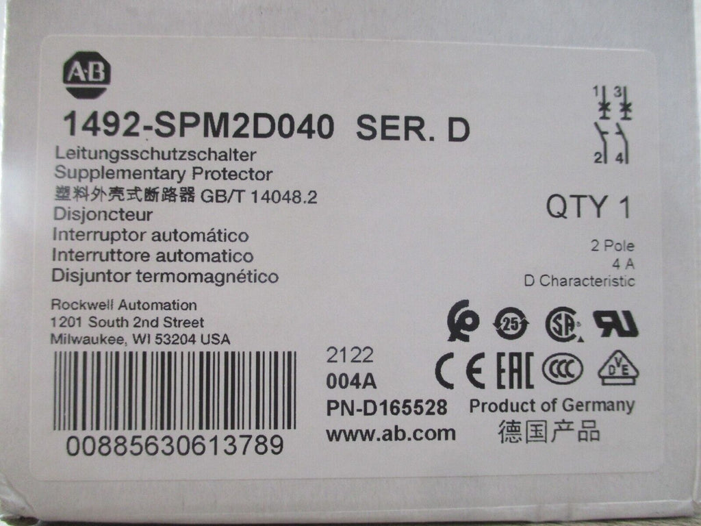 Allen-Bradley Supplementary Protector 1492-SPM2D040 Ser. D 4A 2P New Surplus